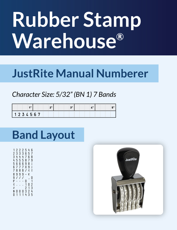The BN-1, 7 JustRite number band stamp comes with 7 bands. Number bands contain numbers 0-9 and special characters. Sturdy plastic handle and quality metal frame will give you a great impression. This stamp is used with a separate rubber stamp pad. Character size is 5/32" which is comparable to 15 point size.