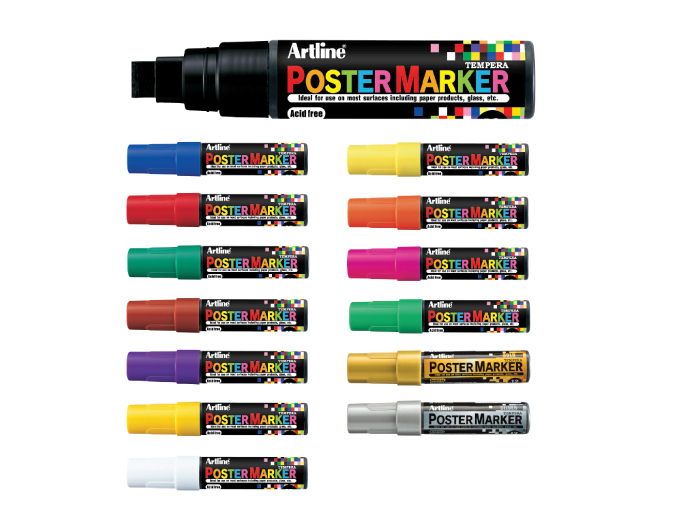 Vivid opaque water based poster paint markers are ideal for posters, menu boards and sign writing. Highly opaque pigment ink with superior water and fade resistant performance is suitable of use on card, metal, plastic, glass, wood, rubber, stone, etc. It allows over-painting without bleed-through. Easily washes of non-porous surfaces and are acid free. 12.0mm wide nib for bold impression. Ideal for headings, underlining and letter shadowing. Sold by the Dozen (12).