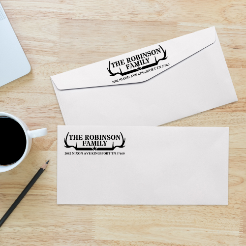 Stamp in style with this unique return address stamp design.  Available in 2 sizes and many ink colors.  Stamp is intended to be used on porous surfaces such as regular paper.  Simply enter your information and we'll create your one-of-a-kind stamp!